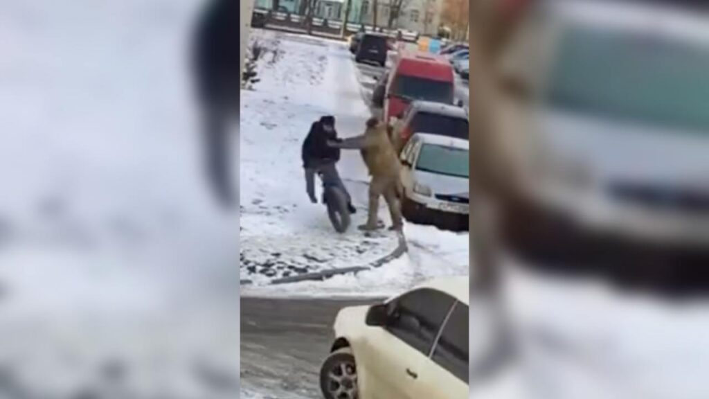 На кадрах видно, як чоловік у формі штовхає велосипедиста, унаслідок чого той втрачає рівновагу та падає на землю.