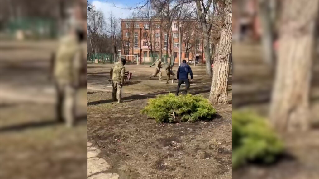 На кадрах видно, як кілька осіб у військовій формі сперечаються з двома цивільними. Один із цивільних лежить на землі біля дерева та отримує удари ногами.
